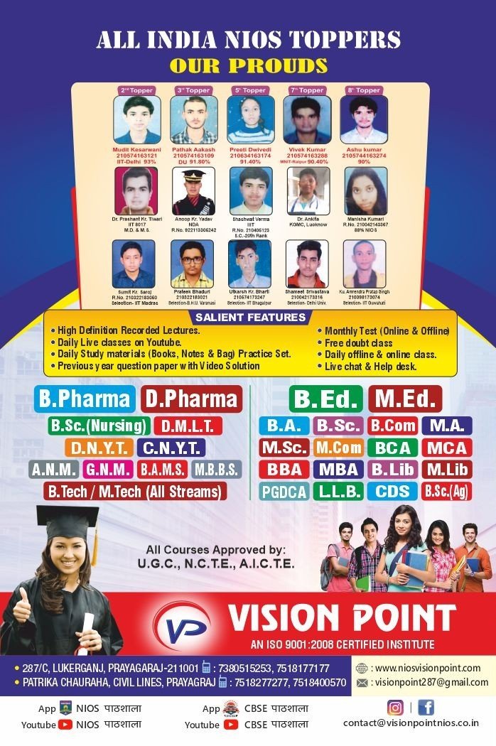 NIOS Vision Point Institute remains the top choice for youngsters when it comes to seeking coaching for various domains like Bed, LLB, BBA, BSc, BCom, BCA, MBA, MCom to name a few in Prayagraj city. NIOS vision point Institute has excelled in providing coaching to all 10th and 12th board students seeking admission. NIOS Vision point provides knowledge based curriculum to the students thus making them ready to face boards as well as competitive exams. This is also the call for all IIT jee and medical aspirants. We provide coaching which prepares you well to face the competitive examination with poise and with ease.